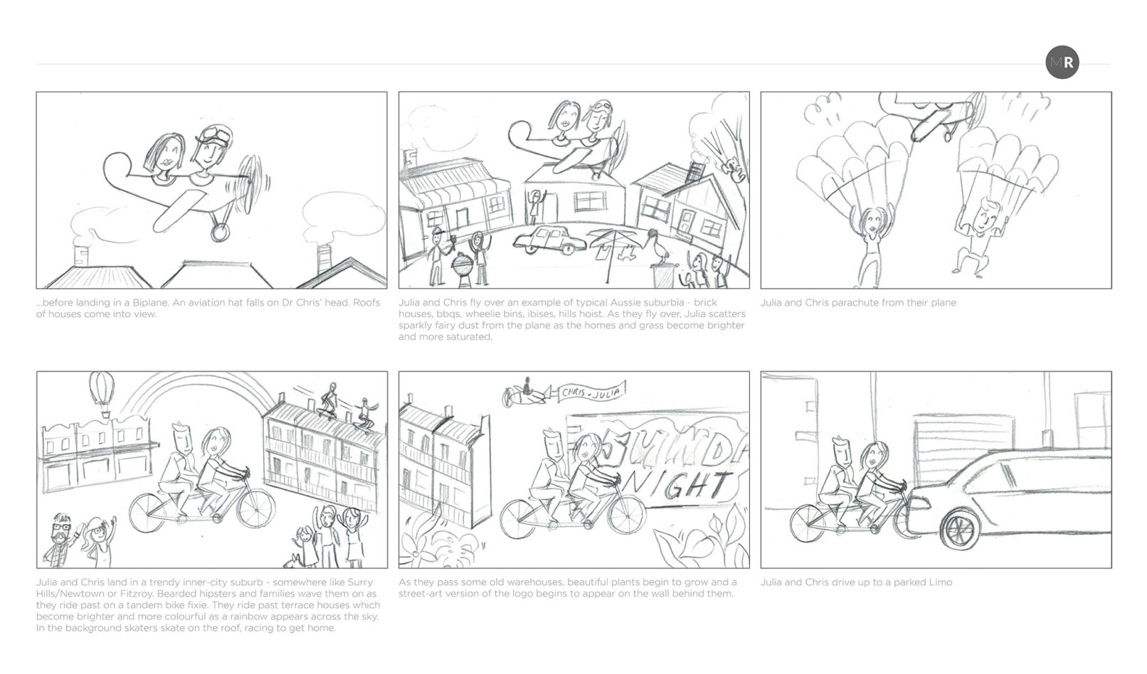 I started by storyboarding our hosts’ journey through 3 distinct styles of Australian suburbs, and created styleframes for each key scene – beachy, suburbia, inner city, and the premiere.