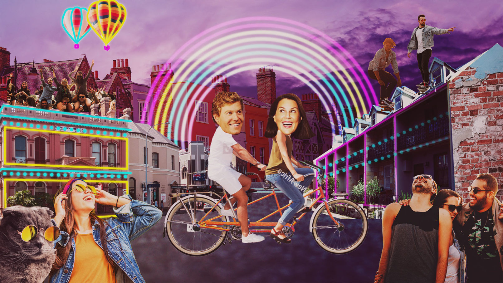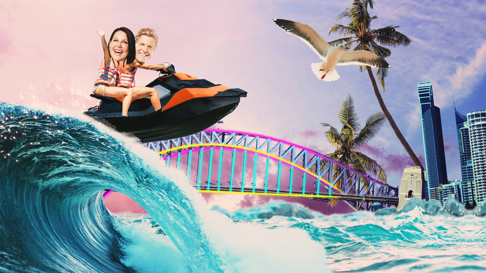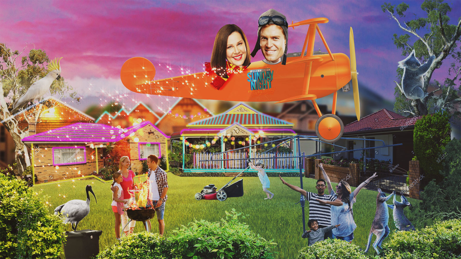Opening title for ITV’s Sunday Night Takeaway with Julia Morris and Dr Chris Brown on Channel Ten. The brief was to create a glitzy and glamorous Australian suburban landscape entirely out of stock imagery for Chris and Julia to travel through on their way to the Sunday Night Takeaway Premiere. Quirky modes of transport, heaps of fun hidden details, and NEON NEON NEON! were the requests – along with the note: “GO CRAZY we can pare it back if we need to!” (spoiler alert: we did not)