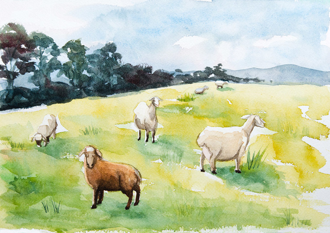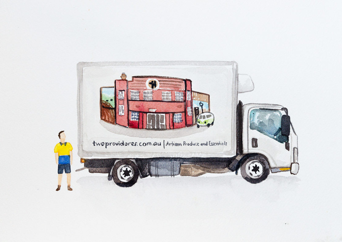 My brief was to paint a series of images depicting the story of a Two Providores product – from the farms where they are sourced, delivery in the iconic Two Providores cardboard box, product unwrapping, plating, and finally, to the plated product being ready to enjoy.